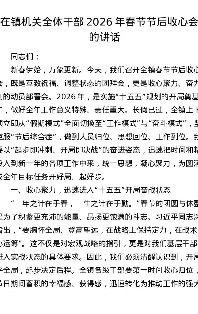 在镇机关全体干部2026年春节节后收心会上的讲话