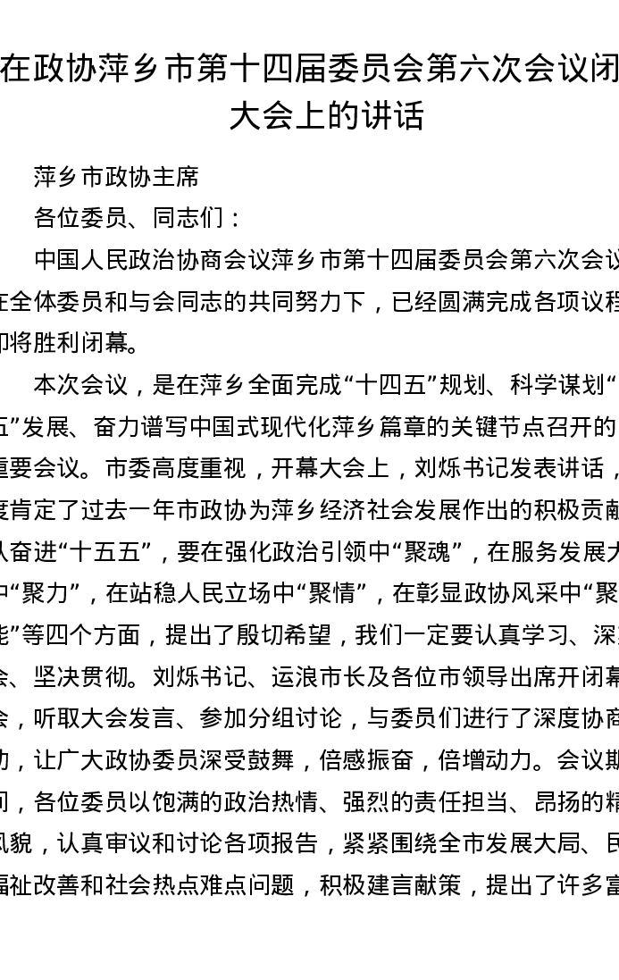 在政协萍乡市第十四届委员会第六次会议闭幕大会上的讲话