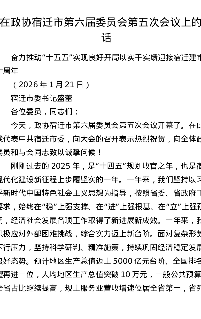 在政协宿迁市第六届委员会第五次会议上的讲话