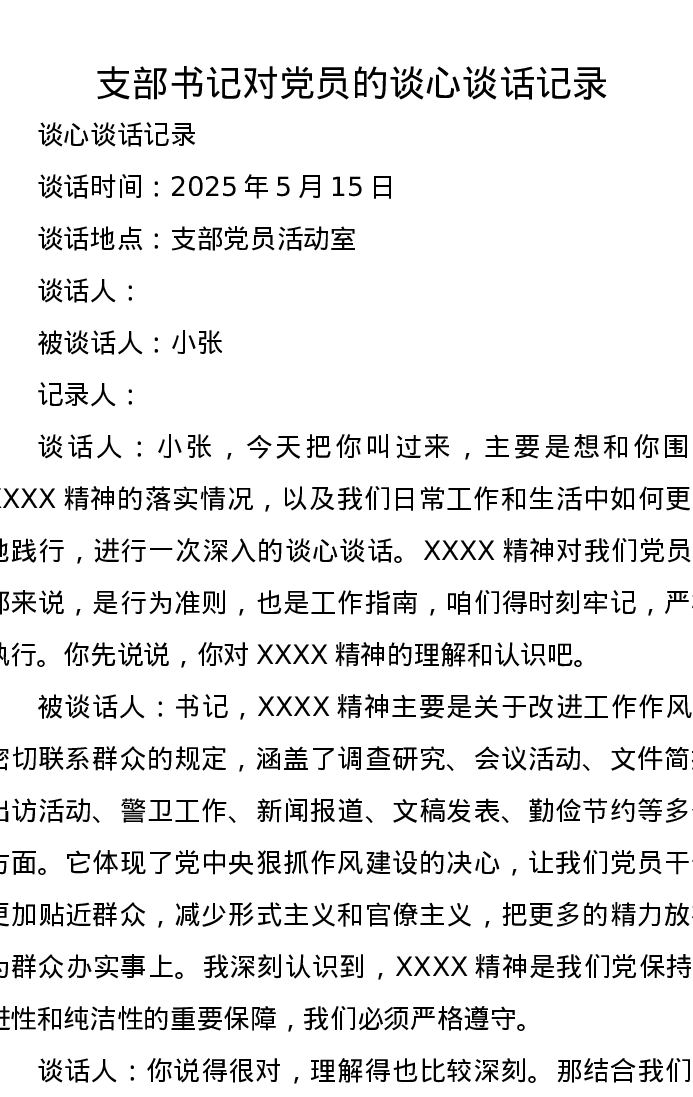 支部书记对党员的谈心谈话记录