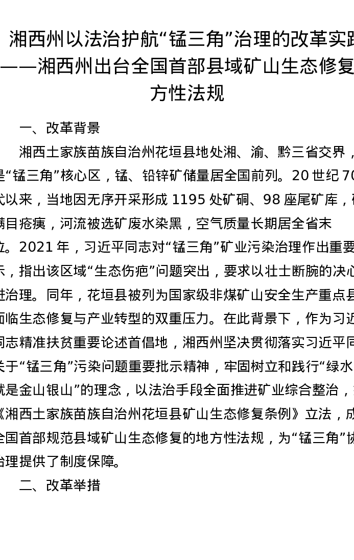 湘西州以法治护航锰三角治理的改革实践——湘西州出台全国首部县域矿山生态修复地方性法规