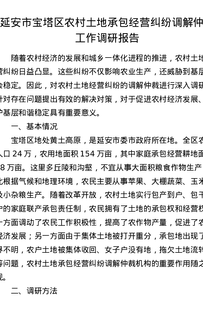延安市宝塔区农村土地承包经营纠纷调解仲裁工作调研报告
