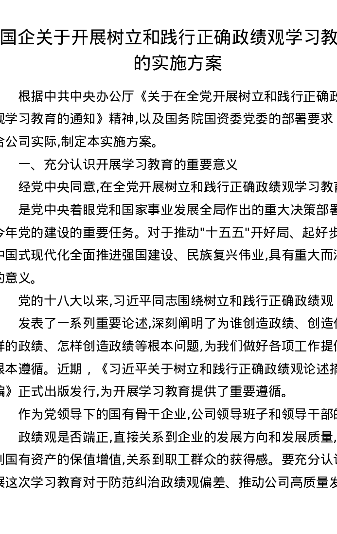 国企关于开展树立和践行正确政绩观学习教育的实施方案