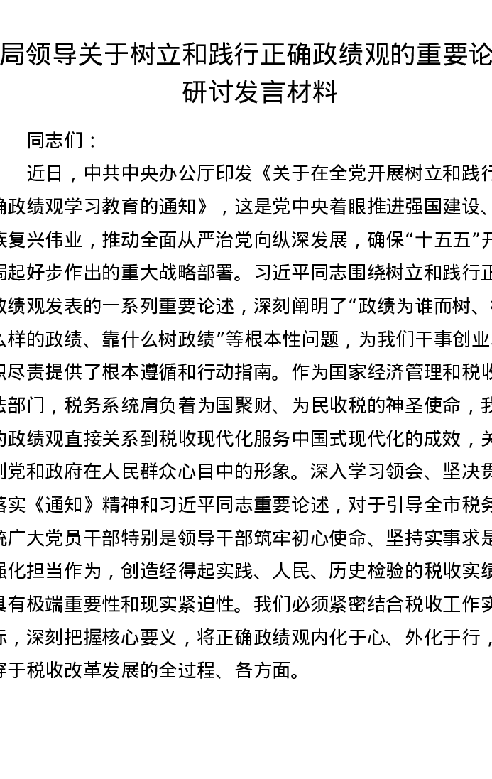 局领导关于树立和践行正确政绩观的重要论述研讨发言材料
