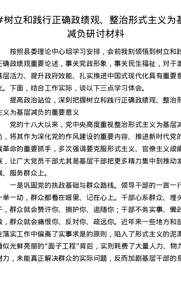 树立和践行正确政绩观、整治形式主义 为基层减负研讨发言材料