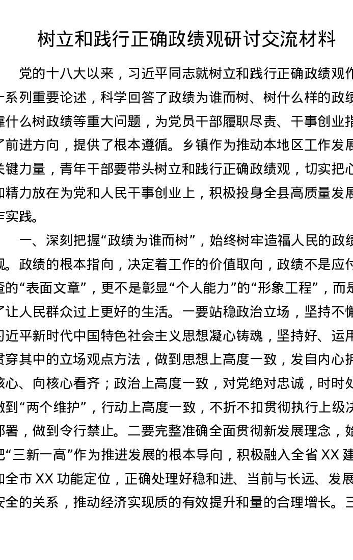 树立和践行正确政绩观研讨交流发言材料