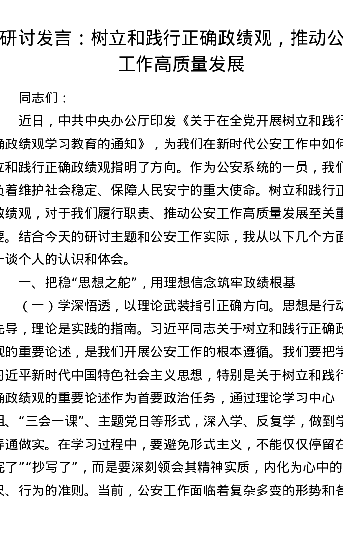 研讨发言:树立和践行正确政绩观,推动公安工作高质量发展