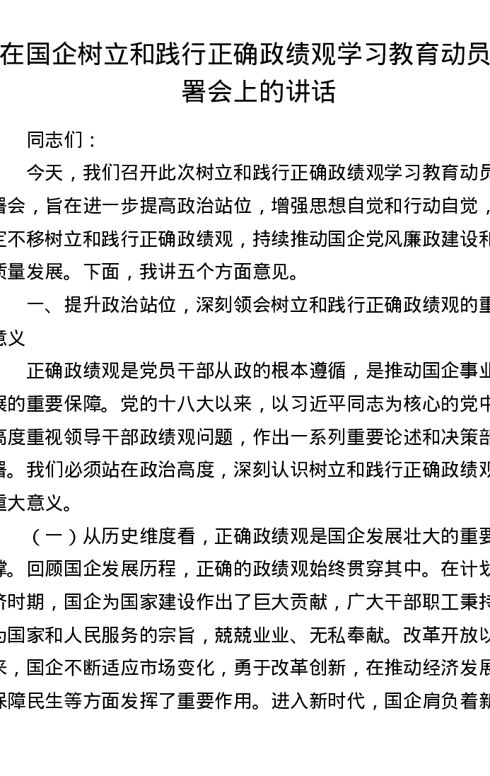 在国企树立和践行正确政绩观学习教育动员部署会上的讲话