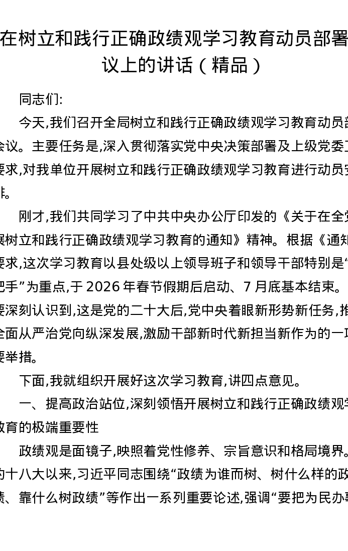 在树立和践行正确政绩观学习教育动员部署会议上的讲话