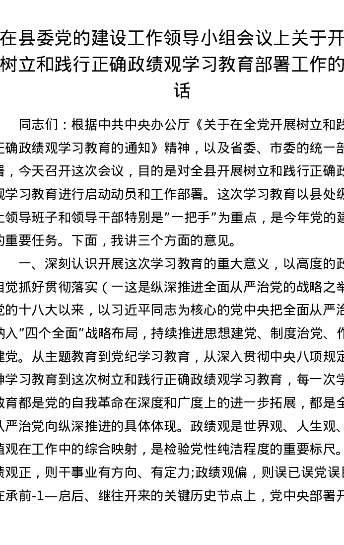 在县委党的建设工作领导小组会议上关于开展树立和践行正确政绩观学习教育部署工作的讲话