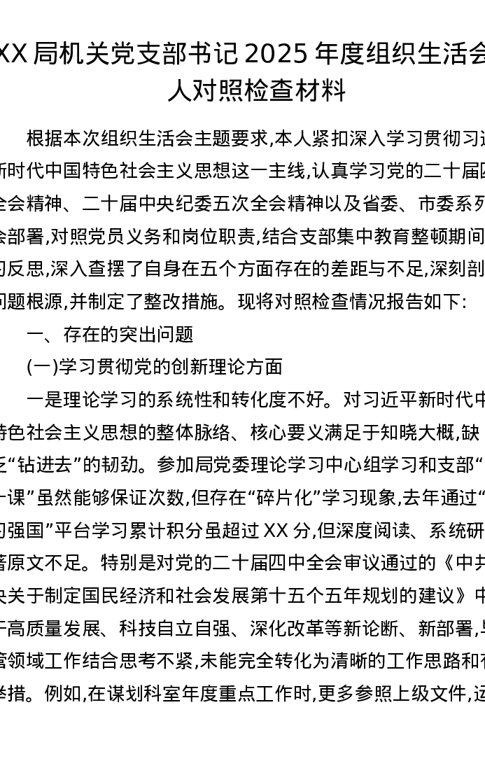 XX局机关党支部书记2025年度组织xxx个人对照检查材料