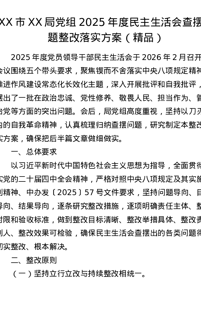 XX市XX局党组2025年度xxxxx查摆问题整改落实方案