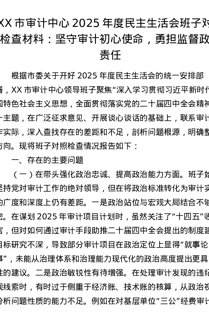 XX市审计中心2025年度xxxxx班子对照检查材料:坚守审计初心使命,勇担监督政治责任