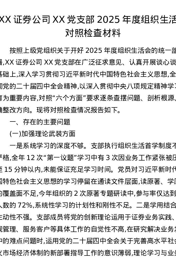 XX证券公司XX党支部2025年度组织xxx对照检查材料