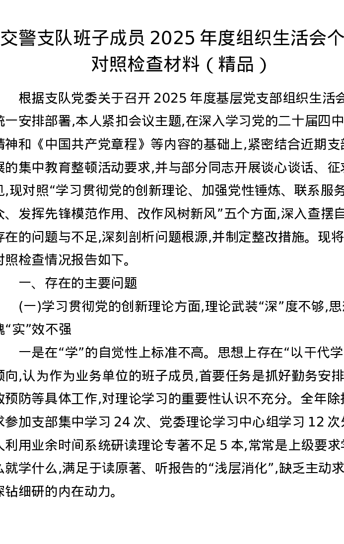 交警支队班子成员2025年度组织xxx个人对照检查材料