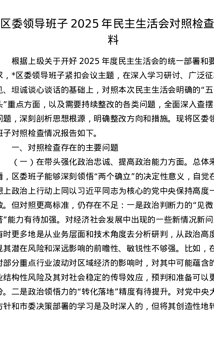 区委领导班子2025年xxxxx对照检查材料
