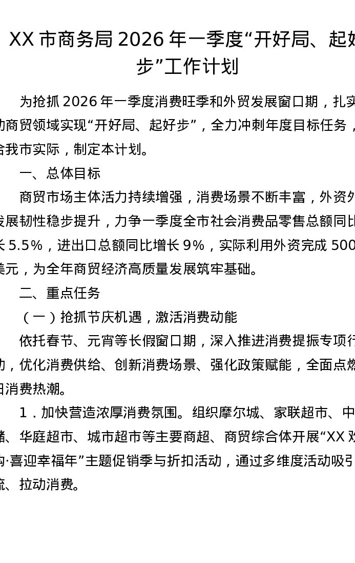XX市商务局2026年一季度开好局、起好步工作计划