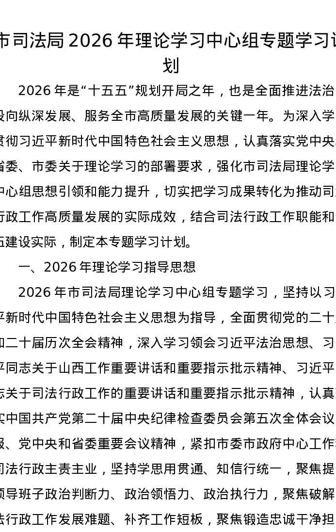 市司法局2026年理论学习中心组专题学习计划