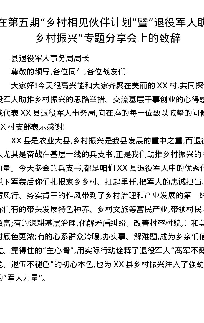 在第五期乡村相见伙伴计划暨退役军人助推乡村振兴专题分享会上的致辞