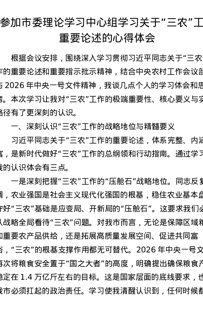 参加市委理论学习中心组学习关于三农工作重要论述的心得体会