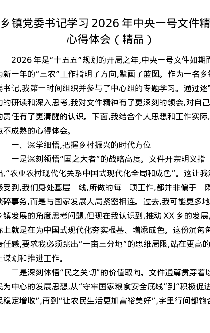 乡镇党委书记学习2026年中央一号文件精神心得体会