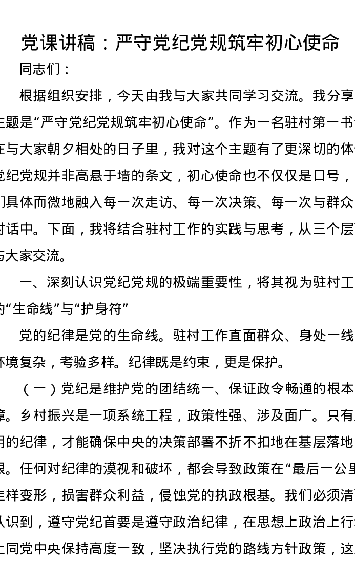 党课讲稿:严守党纪党规 筑牢初心使命