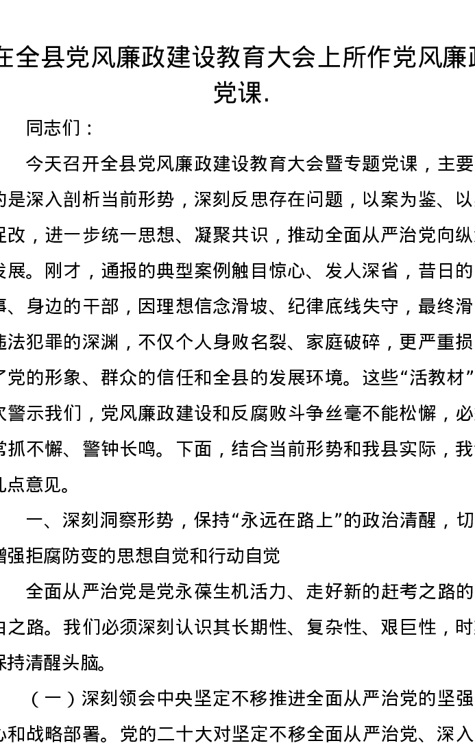 在全县党风廉政建设教育大会上所作党风廉政党课