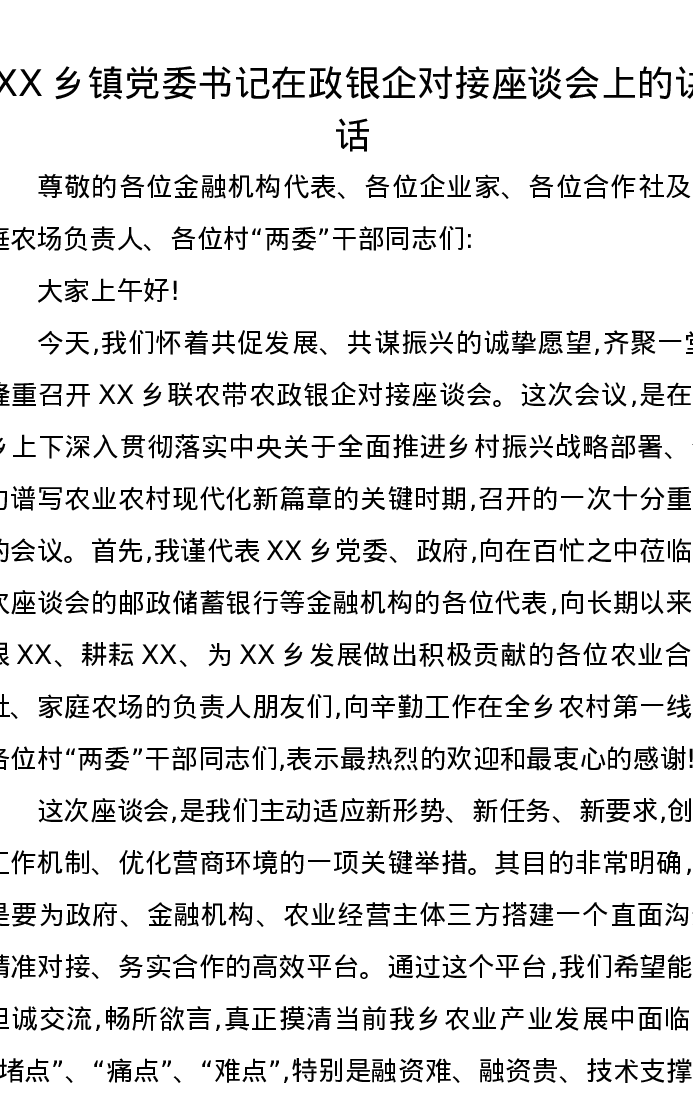 XX乡镇党委书记在政银企对接座谈会上的讲话