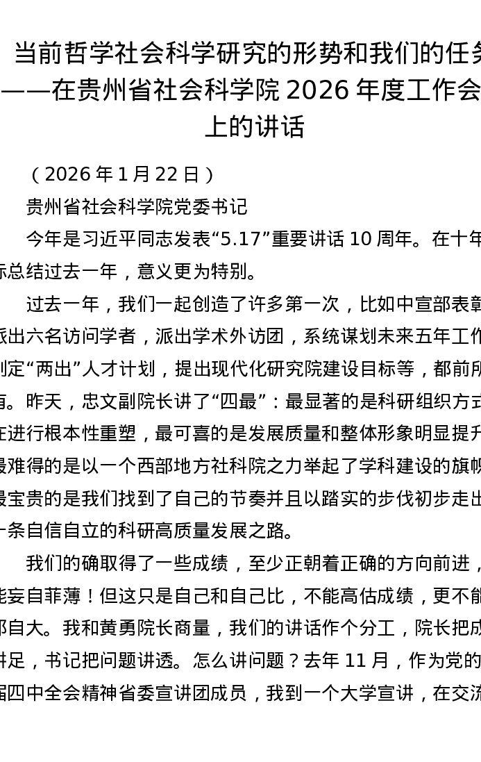 当前哲学社会科学研究的形势和我们的任务——在贵州省社会科学院2026年度工作会议上的讲话