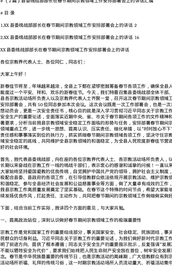 汇编:县委统战部部长在春节期间宗教领域工作安排部署会上的讲话2篇
