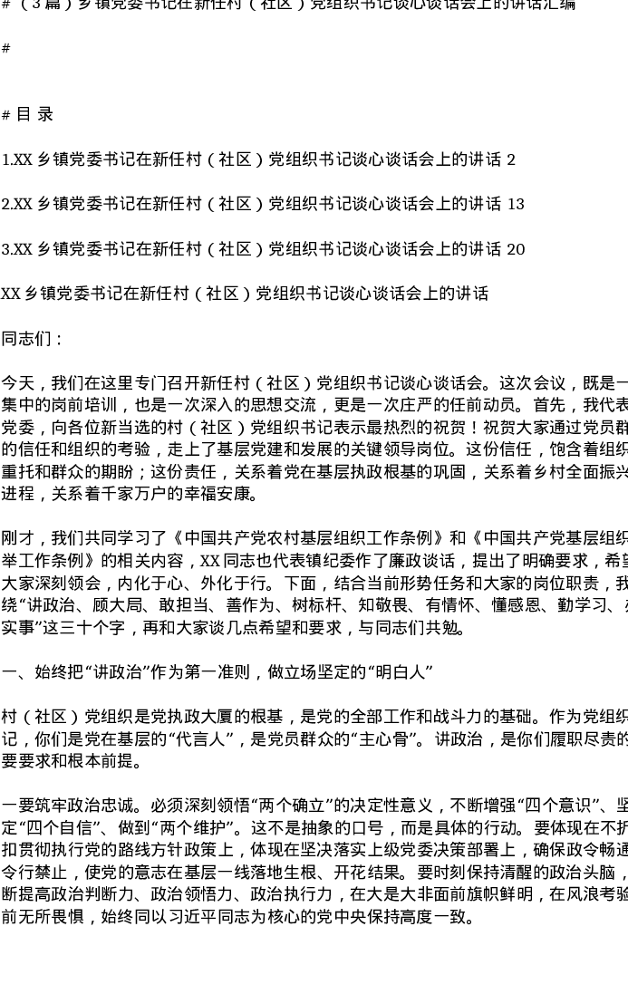 汇编:乡镇党委书记在新任村(社区)党组织书记谈心谈话会上的讲话3篇