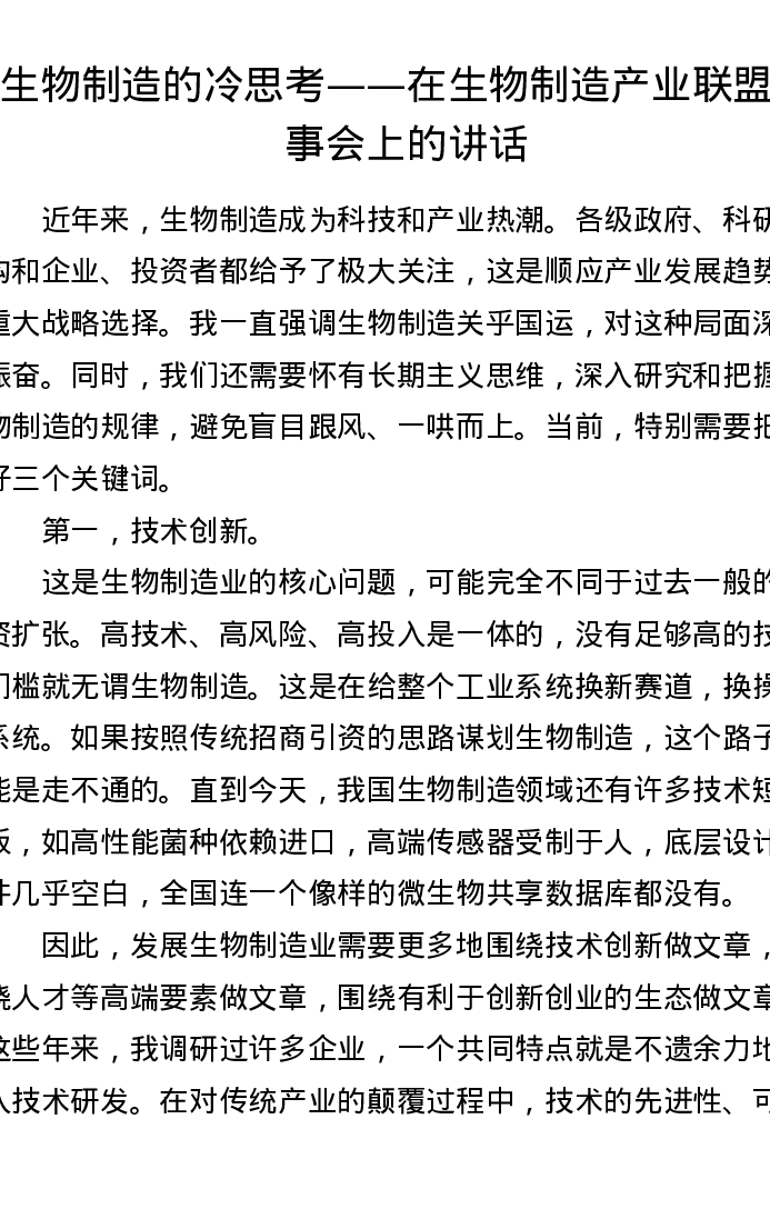 生物制造的冷思考——在生物制造产业联盟理事会上的讲话