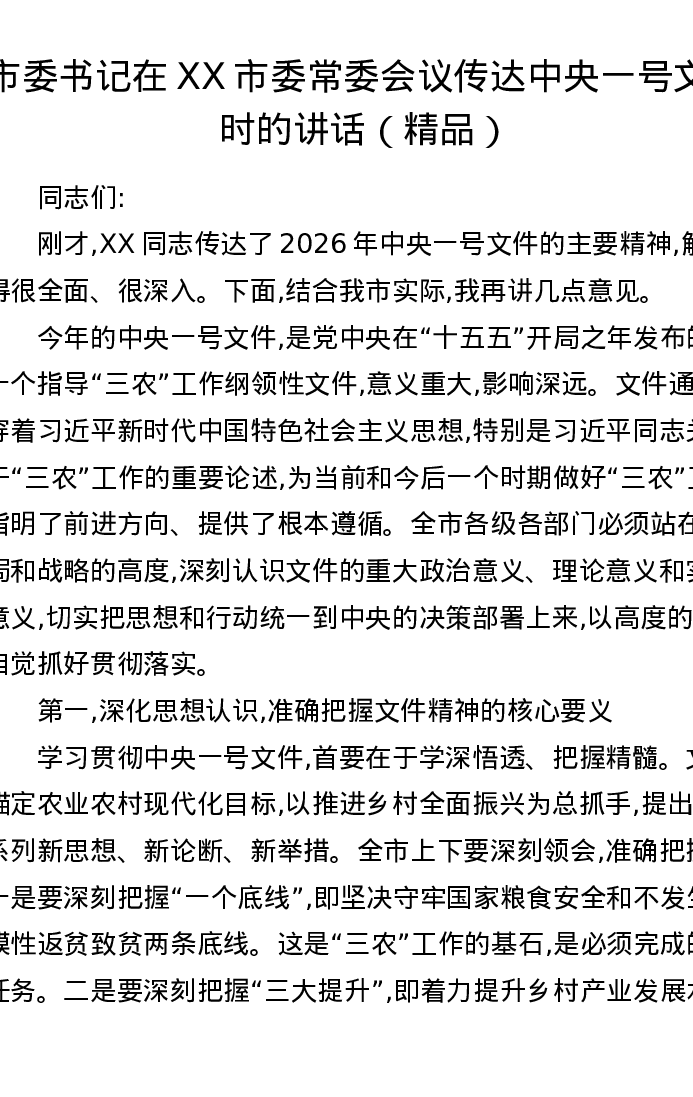 市委书记在XX市委常委会议传达中央一号文件时的讲话