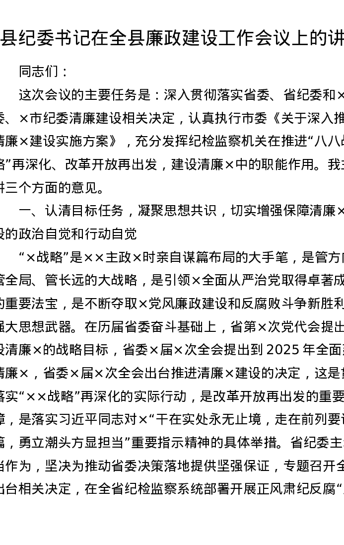 县纪委书记在全县廉政建设工作会议上的讲话