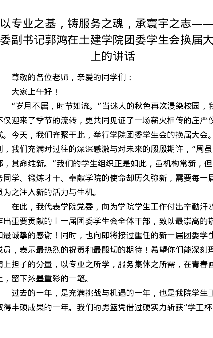 以专业之基,铸服务之魂,承寰宇之志——党委副书记郭鸿在土建学院团委学生会换届大会上的讲话