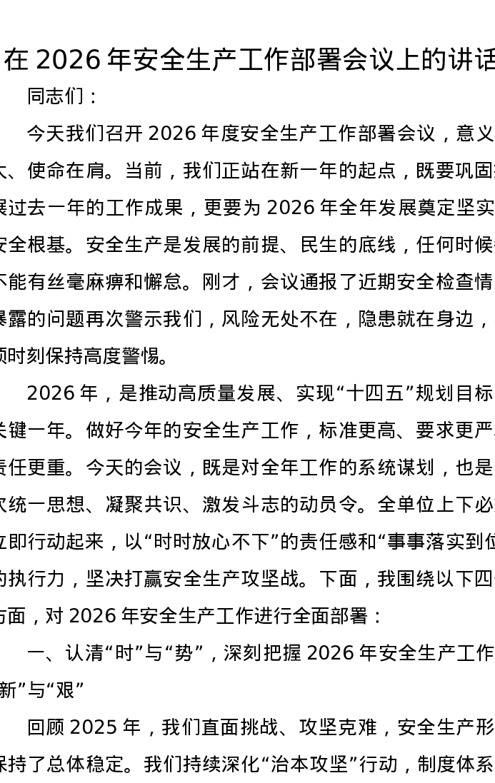 在2026年安全生产工作部署会议上的讲话