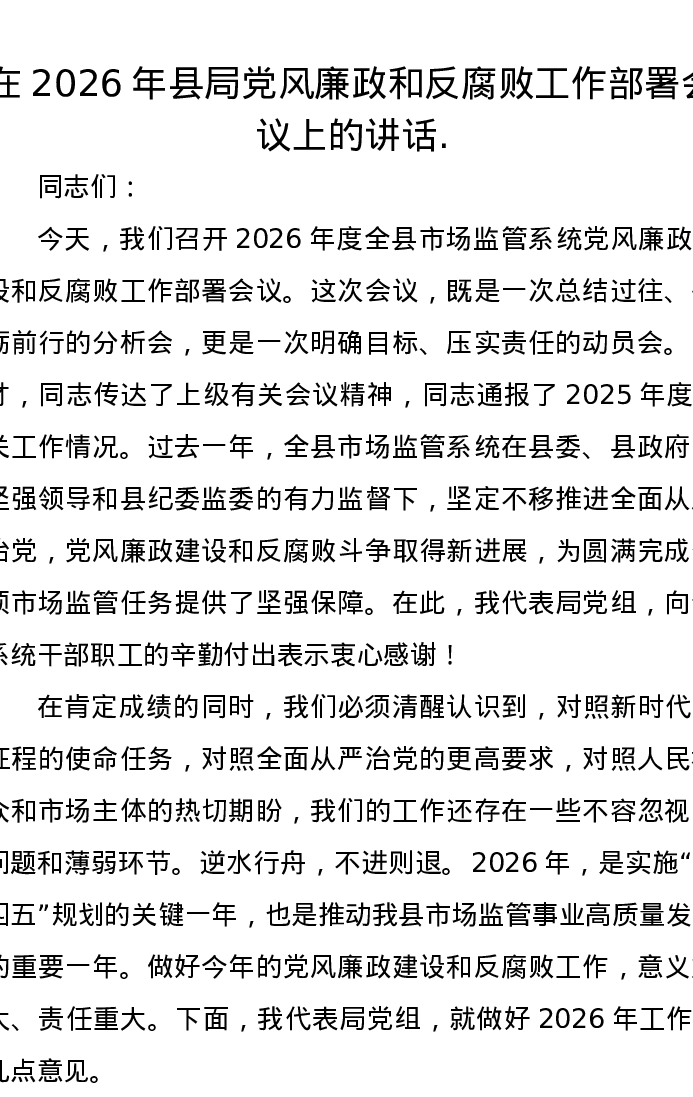 在2026年县局党风廉政和反腐败工作部署会议上的讲话