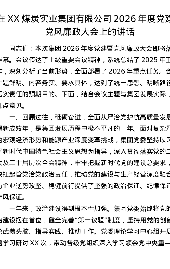 在XX 煤炭实业集团有限公司2026年度党建暨党风廉政大会上的讲话