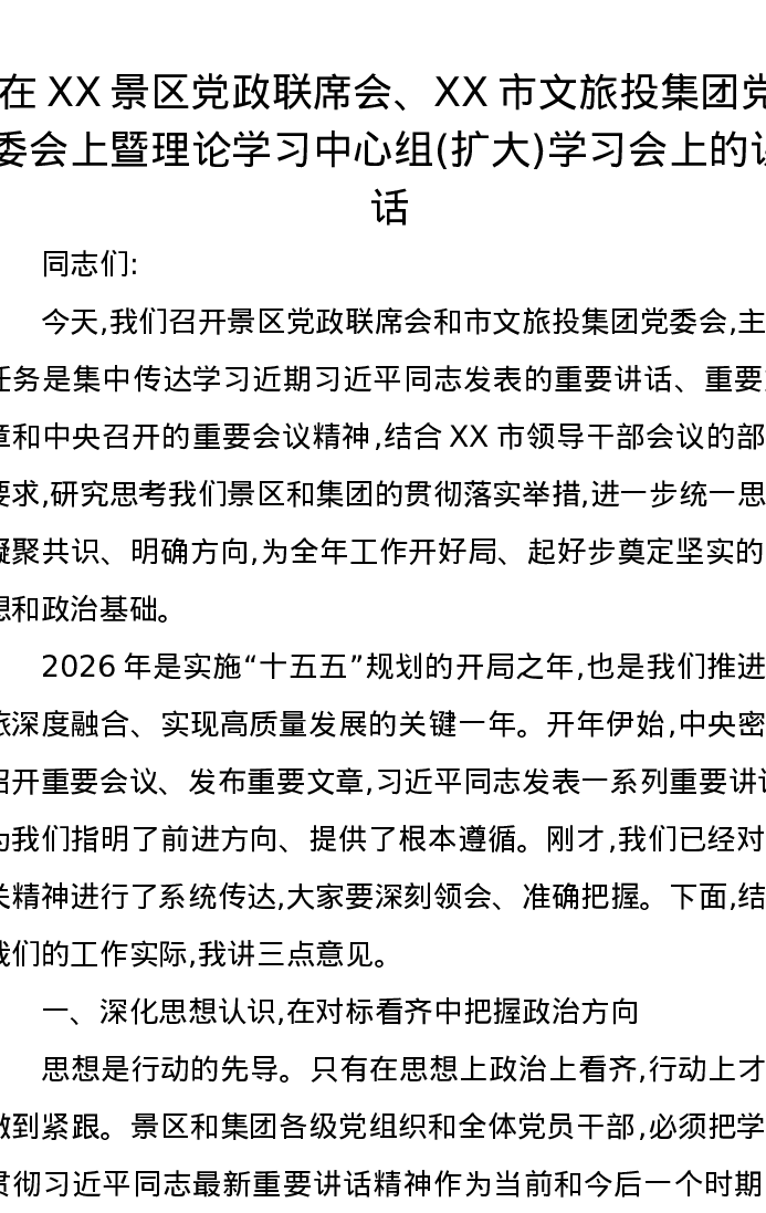 在XX景区党政联席会、XX市文旅投集团党委会上暨理论学习中心组(扩大)学习会上的讲话