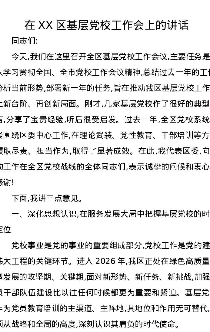 在XX区基层党校工作会上的讲话