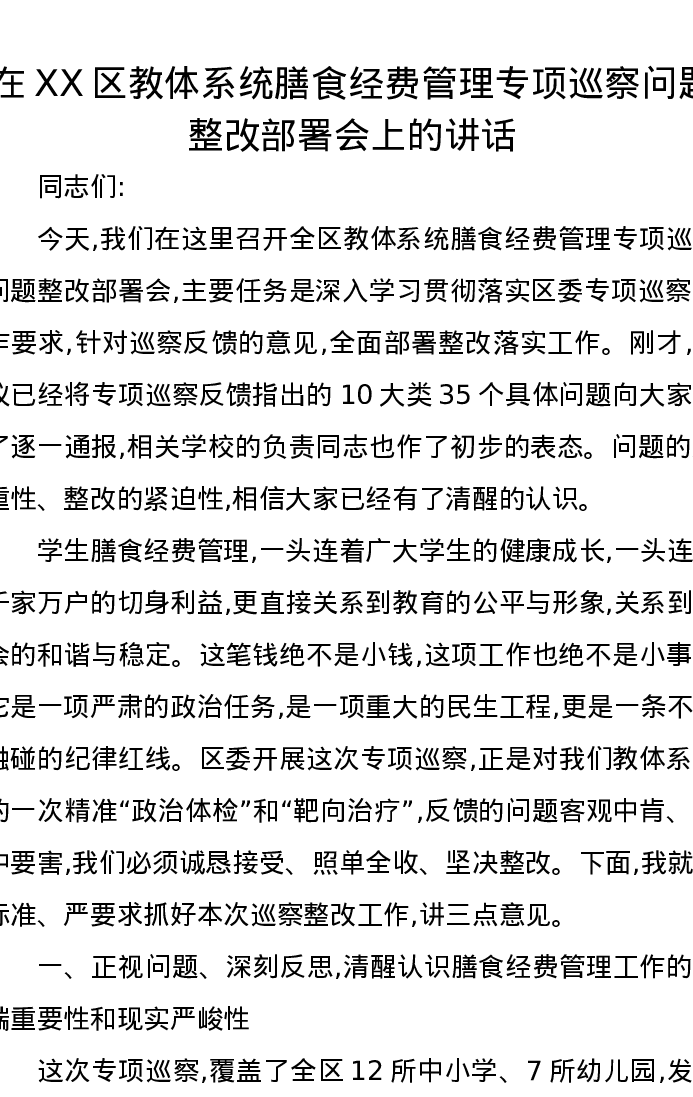 在XX区教体系统膳食经费管理专项巡察问题整改部署会上的讲话