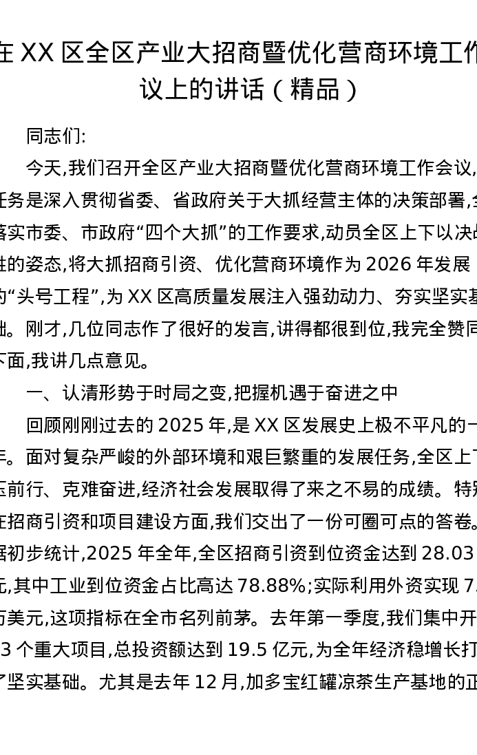 在XX区全区产业大招商暨优化营商环境工作会议上的讲话