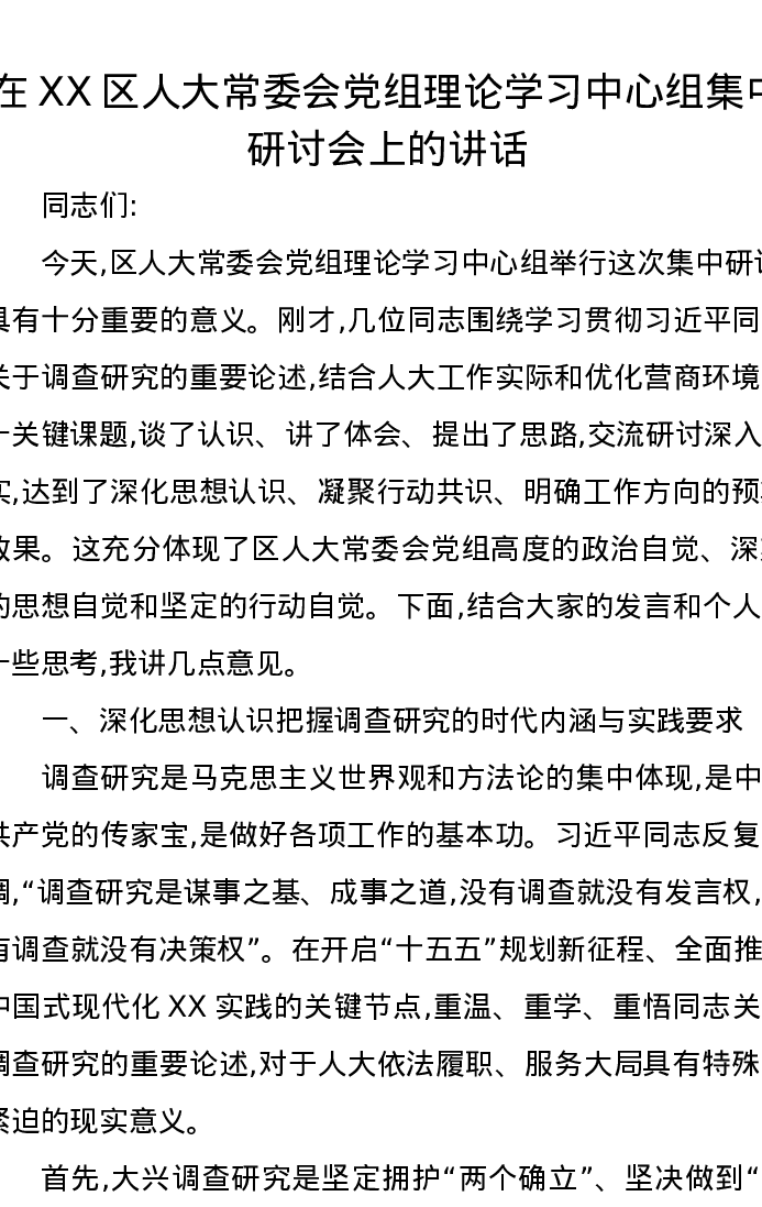 在XX区人大常委会党组理论学习中心组集中研讨会上的讲话