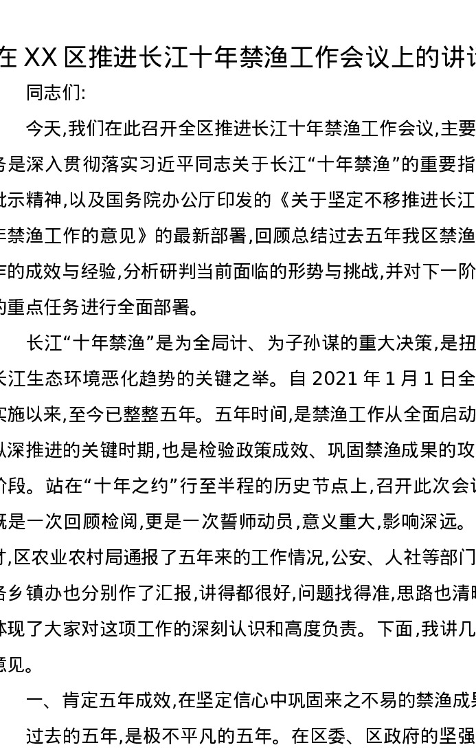 在XX区推进长江十年禁渔工作会议上的讲话