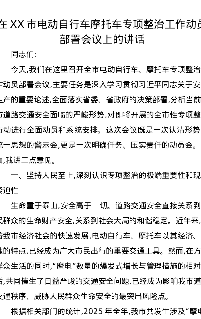 在XX市电动自行车摩托车专项整治工作动员部署会议上的讲话