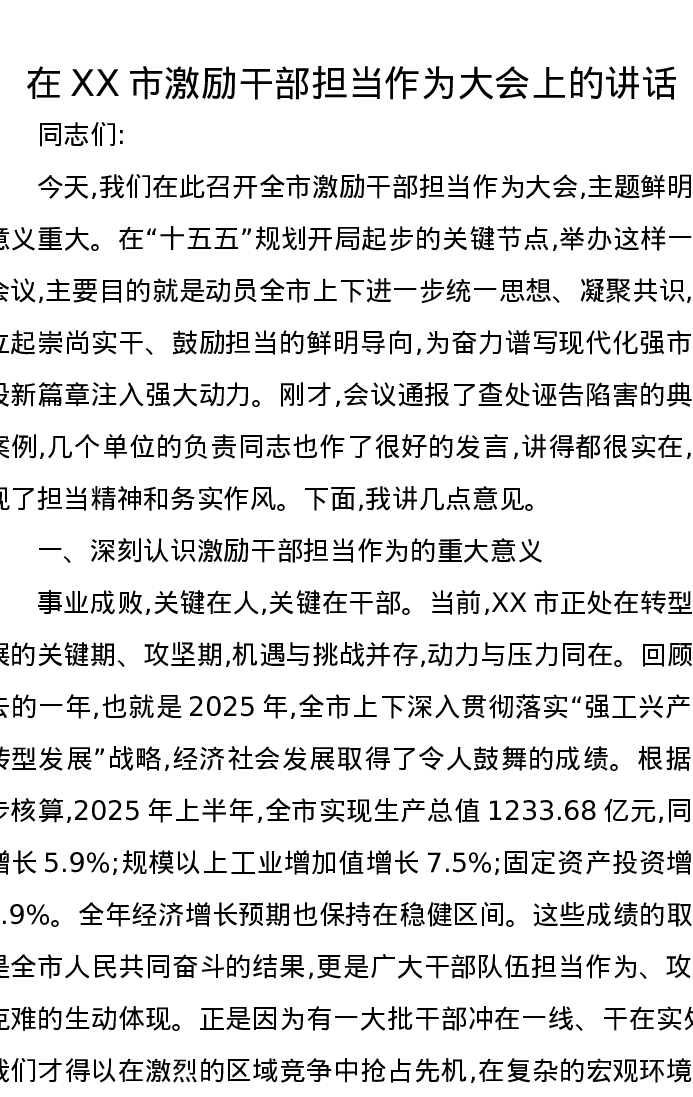 在XX市激励干部担当作为大会上的讲话