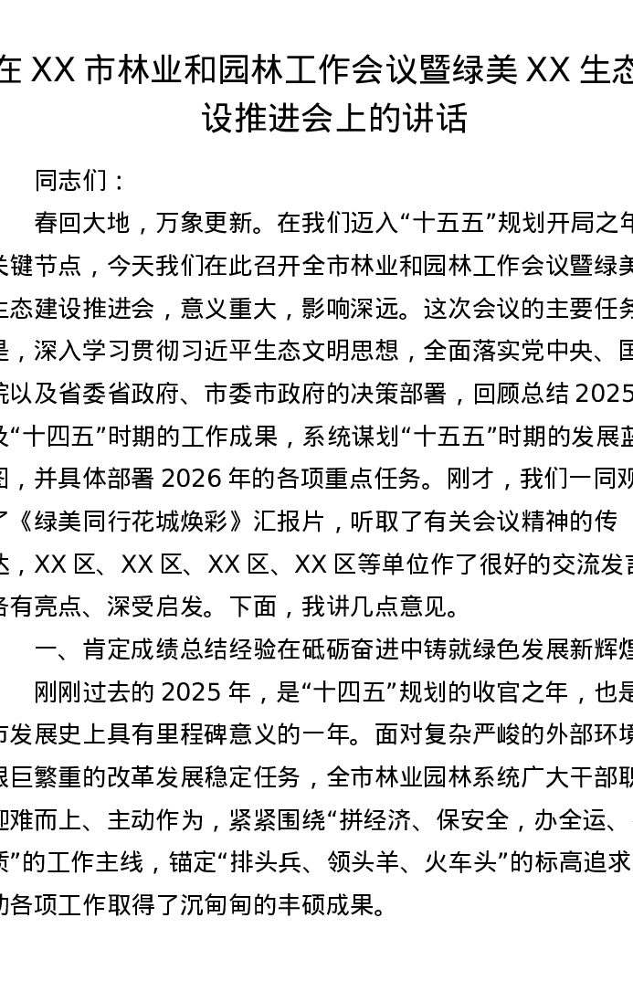 在XX市林业和园林工作会议暨绿美XX生态建设推进会上的讲话