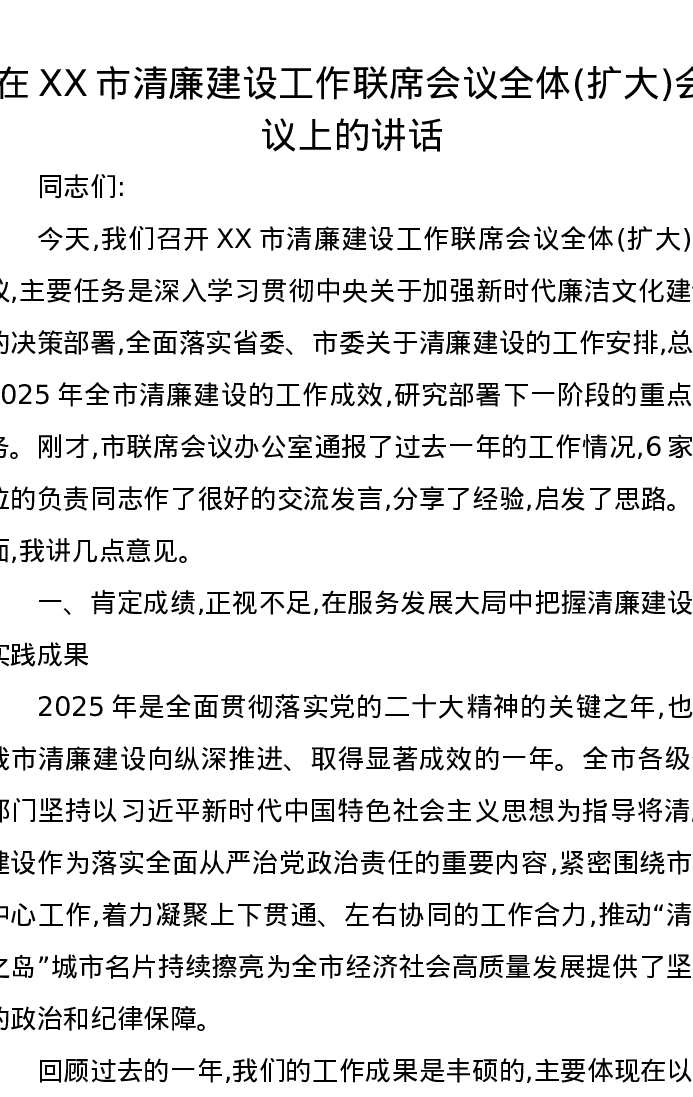 在XX市清廉建设工作联席会议全体(扩大)会议上的讲话