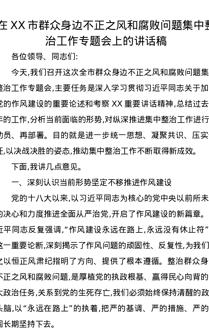 在XX市群众身边不正之风和腐败问题集中整治工作专题会上的讲话稿