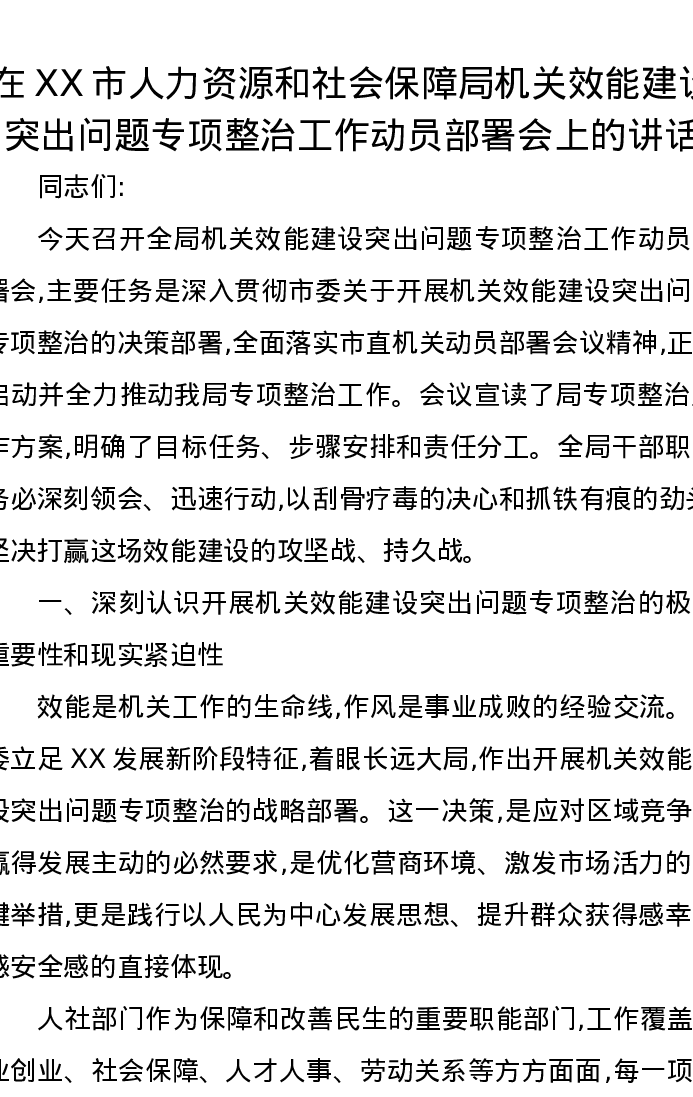 在XX市人力资源和社会保障局机关效能建设突出问题专项整治工作动员部署会上的讲话